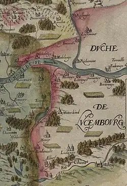 When the province of Trois-Évêchés was created in 1552, a first Franco-Luxembourgish border came into existence: it was located between the north of the arrondissement of Metz and the south of that of Thionville.[2]