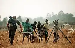In late June 1994, France launched Opération Turquoise, a UN-mandated mission to create safe humanitarian areas for displaced persons, refugees, and civilians in danger; from bases in the Zairian cities of Goma and Bukavu, the French entered southwestern Rwanda and established the zone Turquoise, within the Cyangugu–Kibuye–Gikongoro triangle, an area occupying approximately a fifth of Rwanda.[13] Radio France International estimates that Turquoise saved around 15,000 lives,[14] but the timing of the invasion, with the genocide coming to an end and the RPF's ascendancy, led many Rwandans to interpret Turquoise primarily as a mission to protect Hutu from the RPF, including some who had participated in the genocide.[15] The French remained hostile to the RPF, and their presence temporarily stalled the RPF's advance.[16] According to HRW, Opération Turquoise had another purpose: Preventing a victory by the RPF. HRW reported that some military officers in Paris had talked openly of "breaking the back of the RPF."[7] According to France's National Assembly, there were no documented large-scale killings in Zone Turquoise once it was established. By that same source, it seems the French intervention did provide some significant humanitarian relief in the areas it controlled.[8] However, the French military presence effectively helped the perpetrators of genocide to escape from the RPF and flee into neighboring Zaire.[17][18]