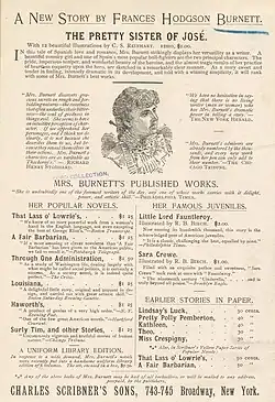 After two years in Paris, the family intended to move to Washington, D.C., where Swan, now qualified as a doctor, wanted to start his medical practice.[2] However, as they were in debt, Frances was forced to live with Swan's parents in New Market while he established himself in D.C. Early in 1877, she was offered a contract to have That Lass o' Lowrie's published, which was doing well in its serialization, and at that point, she made her husband her business manager.[23] That Lass o' Lowrie's was published to good reviews, and the rights were sold for a British edition. Shortly after the publication of the book, she joined her husband in D.C., where she established a household and friends.[24] She continued to write, becoming known as a rising young novelist. Despite the difficulties of raising a family and settling into a new city, Burnett began work on Haworth's, which was published in 1879, as well as writing a dramatic interpretation of That Lass o' Lowrie's in response to a pirated stage version presented in London. After a visit to Boston in 1879, where she met Louisa May Alcott, and Mary Mapes Dodge, editor of children's magazine St. Nicholas, Burnett began to write children's fiction. For the next five years, she had published several short works in St. Nicholas. Burnett continued to write adult fiction as well: Louisiana was published in 1880; A Fair Barbarian in 1881; and Through One Administration in 1883.[2] She wrote the play Esmerelda in 1881 while staying at the "Logan House" inn near Lake Lure, North Carolina; it became the longest-running play on Broadway in the 19th century.[25] However, as had happened earlier in Knoxville, she felt the pressure of maintaining a household, caring for children and a husband, and keeping to her writing schedule, which caused exhaustion and depression.[24]