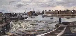 At the start of the Second World War, Macdonald intended to volunteer for nursing duties but was surprised to receive a war artist commission, given how recently she had been a student.[2] Throughout the War Macdonald received a number of short-term contracts and commissions for individual pictures from the War Artists' Advisory Committee (WAAC), and the Recording Britain project that kept her employed as an artist throughout the conflict. Macdonalds commissions included both nursing scenes, which WAAC often allocated to women artists, and heavy industrial production and repair work. The first picture Macdonald submitted to WAAC, showing people in a shelter at Queen Alexandra Military Hospital at Millbank during an air raid was deemed unacceptable due to the evident fear and apprehension portrayed. A second hospital painting was accepted in January 1941 and a new depiction of the Millbank air raid was accepted in November 1941. When the QAM Hospital was evacuated to Oxford, Macdonald followed and was permitted to paint at the nearby aircraft dump at Cowley. This resulted in three paintings, one of which was declined by WAAC. During the war, other paintings by Macdonald were accepted by the Committee but were then prohibited from going on public display by wartime censorship, if for example they showed structures built after 1939. In September 1941, she returned to London to paint a cityscape showing St Paul's Cathedral. A painting by Macdonald of the cathedral surrounded by bombed streets was shown in America during the war but was lost when the ship returning it to Britain was torpedoed and sunk.[2] Later commissions included the London Docks, aircraft repair shops and Bailey bridges plus a portrait of their inventor Donald Bailey.[4] In all, nineteen works by Macdonald were acquired by WAAC, including Building the Mulberry Harbour, London Docks (1944) which was requested by the Tate for its permanent collection at the end of the war.[5] The Imperial War Museum also has a number of works by Macdonald.[6]