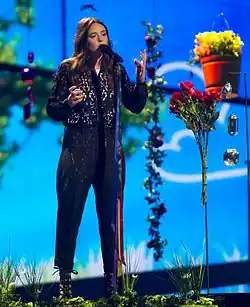 In January 2016, Michielin also embarked on her first concert tour, titled Nice to Meet You.[49] A live extended play was recorded during the show and released exclusively to digital stores on 30 January 2016.[50] In February 2016, she competed in the 66th Sanremo Music Festival, performing the song "Nessun grado di separazione".[51] The song placed second in the competition, behind Stadio's "Un giorno mi dirai".[52] The band was then eligible to represent Italy in the Eurovision Song Contest 2016, but they declined, stating they would be on a previously planned tour in May 2016. Their decision led RAI to select Michielin as the Italian entry for the 61st edition of the European competition.[53][54] Michielin's entry was a new version of "Nessun grado di separazione", featuring an English-language chorus and titled "No Degree of Separation".[55] In the final she placed 16th out of 26.[56] "Nessun grado di separazione" debuted atop the Italian singles chart and was included in di20are, a new edition of Michielin's second studio album.[57][58]