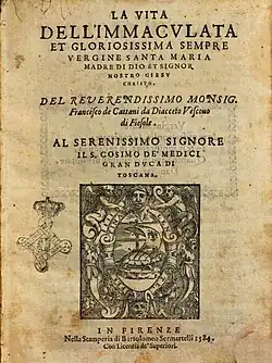 ![]() Title-page of La vita dell'immaculata et gloriosissima sempre vergine santa Maria madre di Dio, published in Florence in 1584 | |
