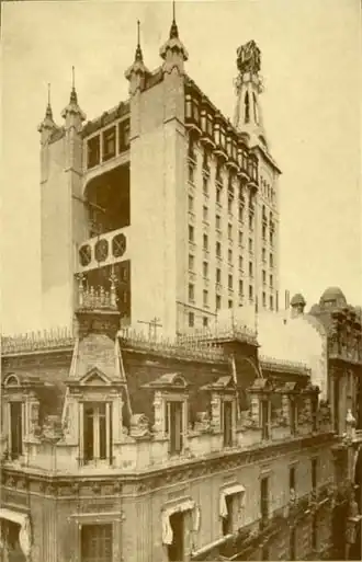 Following work on a number of apartment buildings and private residences, Gianotti was commissioned to design the La Inmobiliaria Building (on Avenida de Mayo) in 1910, and Galería Güemes in Florida Street, possibly one of his best works, in 1913; with 14 floors, and a height of 80 m, it was considered to be the first skyscraper in Buenos Aires. Two years later, in 1915, a famous local confectioner, Cayetano Brenna, commissioned him to design the Confitería El Molino. Located on the corner of Callao and Rivadavia Avenues, the building became a well-known landmark in the city. Until 1918 he designed mainly in the Art Nouveau style, but later employed a more orthodox Eclecticism combining Italianate and Moorish revival styles, notably in the Italian-American Navigation Company Building (1927) on 622 Diagonal Norte Avenue. Gianotti also created works of Neoclassical architecture, notably the El Mundo newspaper offices on 647 Diagonal Norte (1925), and the Schaffhausen Building (336 Reconquista St.), in 1932.