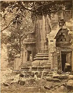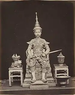 In his government service, Chit was a royal servant of the Front Palace under Second-King Pinklao until Pinklao's death in 1866, when he transferred to serve the Royal Palace of King Mongkut. He received the noble title Khun Sunthonsathitsalak ('officer for fine likeness images'), and served under the department of the royal armoury.[1] Other from royal portraiture, major works he produced in this official capacity include an expedition to photograph the ruins of Phimai (now Phimai Historical Park in Nakhon Ratchasima Province), as well as photographing the total solar eclipse of 18 August 1868, in which he was part of the royal entourage observing the phenomenon at the village of Wa Ko (now in Prachuap Khiri Khan Province).[2][3]