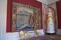 A set of six pieces, representing the history of Hero and Leander from Cleyn's designs were at the Louvre in Paris; and there are some fine pieces of grotesque at Petworth House. The grotesques and other ornaments in these works, a line in which Cleyn appears to have been unrivalled, have always been greatly admired, and some modern authorities have had no hesitation in ascribing them to the hand of Anthony van Dyck or some more famous painter, ignoring the fact that Cleyn was spoken of at the time as a second Titian, and as "il famosissimo pittore, miracolo del secolo". Cleyn was also largely employed by the nobility to decorate their mansions. Samples of his work in this line were to be seen at Somerset House, Carew House, Parson's Green, Hanworth Palace, Wimbledon Palace, Stone Park, Northamptonshire, Bolsover Castle, and the Gilt Room at Holland House, London.[1] Cleyn's name has become attached to the design of chairs with scallop shells backs which furnished these interiors.[2]