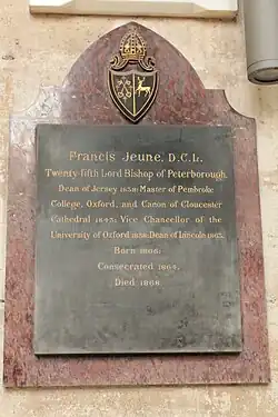 Appointed Dean of Lincoln in January 1864, Jeune soon vacated that office when appointed Bishop of Peterborough. Jeune was consecrated as bishop on St Peter's Day 1864, by Charles Longley, Archbishop of Canterbury at Canterbury Cathedral.[2]