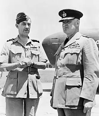 ![]() Air Marshal Linnell (left) meets Alfred Critchley (right), the newly appointed Director-General of British Overseas Airways Corporation at an airfield in the Middle East, 1943 | |