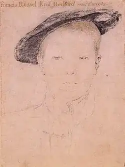 Francis was the son of John Russell, 1st Earl of Bedford and Anne Sapcote.[1] He was educated at King's Hall, Cambridge and accompanied his father, to sit in the House of Commons. He represented Buckinghamshire in parliament in 1545–47 and 1547–52. In 1547 he was appointed High Sheriff of Bedfordshire and Buckinghamshire. He assisted to quell the rising in Devon in 1549, and after his father had been created Earl of Bedford in January 1550, was known as Lord Russell, taking his seat in the House of Lords under this title in 1552.