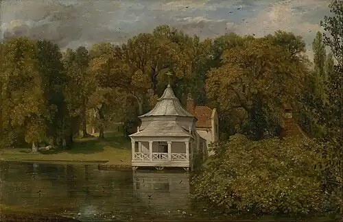 Constable stayed in contact with Rebow after this, returning to Wivenhoe in August 1817 where he made two drawings. In August 1819 Rebow corresponded with Constable about having the artist visit again to paint a group portrait of the Rebow family. While Constable intended to fulfil the engagement, Rebow evinced doubts that he would be able to find the time for the painting to be completed because of a busy social schedule, and as no such portrait survives or is recorded it is likely that Constable never visited Wivenhoe to begin it.[19] Rebow is described by art historians Leslie Parris and Ian Fleming-Williams as a more sympathetic patron of Constable than others such as Richard Benyon De Beauvoir.[20]