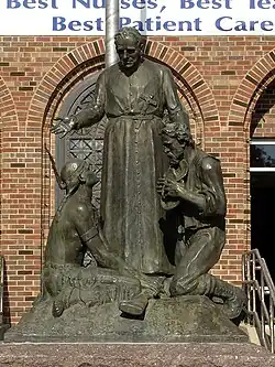 - A statue of Fr. Pierz, which celebrates his role as a missionary and peacemaker by showing an Ojibwe warrior and a German-American settler kneeling before him, was dedicated in front of St. Cloud Hospital in 1952.[68] During the early 21st century, however, the statue was removed following protests by the St. Cloud chapter of the American Indian Movement, who had believed, incorrectly, that Fr. Pierz was associated with the much later linguistic imperialism, English only policy, and the other abuses within the residential school system. The statue was re-erected inside Billig Park, along Main Street South, in nearby Pierz, Minnesota as the Reverend Father Pierz Monument.[69]