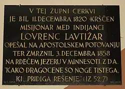In 1857, Fr. Pierz also invited fellow Slovenian missionary Fr. Lovrenc Lavtižar to Minnesota, where he was assigned to the Red Lake Indian Reservation. During the night of December 3, 1858, Fr. Lavtižar froze to death during a blizzard while returning across the ice of Red Lake after giving the Last Rites to a dying Ojibwe Catholic.[30][31] Fr. Pierz subsequently eulogized his deceased fellow missionary in a work of Slovenian poetry, which he titled Spomenik Lovrencu Lavtižaru, bivšemu misijonarju v severni Ameriki.[32]