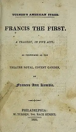 Francis the First is an 1832 historical tragedy written by the British actress Fanny Kemble. It is based on the reign of Francis I of France in the sixteenth century. It premiered at the Theatre Royal, Covent Garden in London on 15 March 1832.[1] The original cast included Kemble herself as Louisa of Savoy, Mason as Francis the First, Charles Kemble as Charles of Bourbon, Daniel Egerton as Chabannes, George Bennett as Laval, William Abbot as Clement Marot, Robert Keeley as Triboulet, John Duruset as Bonnivet, James Prescott Warde as Gonzales, Harriette Taylor as Margaret Valois and Ellen Kean as Francois de Foix. Kemble had originally conceived it as a historical novel before converting it into a stage play. Kemble was paid a large sum for the rights by publisher John Murray, and it enjoyed brief success on stage, although she herself was later critical of its "stilted declamation"[2]