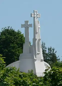 Bishop Jerzy Tyszkiewicz started an official canonization case in 1649 and ordered a search of the remains of the martyrs. The results of the search are not known. It is likely that canonization efforts were abandoned due to the Russo-Polish War (1654–67) and Tyszkiewicz's death in 1656.[3] Three wooden crosses were built on the Bleak Hill (now in Kalnai Park) where the martyrs were reportedly beheaded.[1] The exact date of the construction is unknown, but it was possibly related to the efforts of canonization. The first undoubted representation is from a 1648 panegyric to Bishop Tyszkiewicz.[3] According to Jan Nepomucen Fijałek, the Three Crosses were also depicted on two silver portraits of St. Casimir that were made in 1636 and were present in Vilnius Cathedral until the first half of the 20th century.[3] Wooden crosses would rot and needed to be periodically replaced. Concrete monuments were erected in 1916 (architect Antoni Wiwulski; torn down in 1950) and 1989 (architect Henrikas Šilgalis).[4]