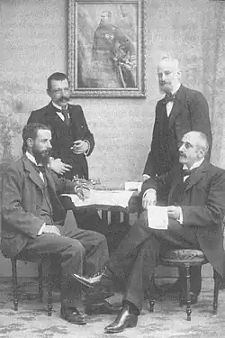 Shortly after arrival in Buenos Aires Oller found an office job in Casa de Comercio, which he would hold for 16 years to come.[64] According to his own account most of the 1890s was a difficult time; thought not in poverty,[65] he had to work hard, especially that his wife was under constant medical treatment.[66] However, he found some time to pursue interest in letters; in 1896 his historiographic booklet España en el mundo earned him primer premio de prosa in Juegos Florales del Centro Unión Obrera Española,[67] and in 1897 he published Certamen Franciscano Literario y Artístico, follow-up of cultural event organized by the local Franciscans.[68] Francisco Melgar, the secretary of the claimant, in epistolographic exchange encouraged Oller to resume propagandistic activities; the 1898 personal letter from Carlos VII was written to the same purpose; also, the claimant nominated Oller his representative in Southern America.[69] Oller set up Comisión Central de Propaganda Carlista en la América del Sud;[70] its branches appeared in Uruguay,[71] Bolivia,[72] Paraguay, Peru and Ecuador.[73]