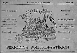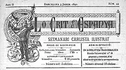 Except an unsuccessful 1886[26] attempt to run for Diputación Provincial of Barcelona,[27] Oller focused on propaganda. Apart from a theatrical drama Combates del corazón (1884) he wrote La España Carlista (1885),[28] a set of essays revolving around the Third Carlist War and largely formatted as polemics with Antonio Pirala.[29] He also wrote few prologues[30] and one translation from French.[31] In 1887 he assumed management of Lo Crit de la Patria and steered it as a vehement Carlist propaganda vehicle,[32] publishing venomous diatribes against the Madrid governments.[33] However, in 1888 he faced a conflict within Traditionalist ranks, caused by secession of Nocedal-led faction named Integrists. Quintana assumed ambiguous stand, and Oller suspended his collaboration having declared that “l’estat de la lluyta actual dins lo partit carlista” makes him re-consider. Eventually, when Lo Crit de la Patria sided with the rebels, Oller opted for total loyalty to his king and left the periodical.[34]