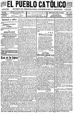 In 1893 Ureña was engaged in launch of El Pueblo Católico, a Jaén-based bi-weekly.[33] According to some sources he was the key man behind the enterprise,[34] according to others it was rather Emilio Mariscal Mendoza, who financed the launch and became the first director.[35] Exact Ureña position in relation to El Pueblo during first decades of its lifetime is in doubt; numerous sources present him as spiritus movens, yet it remains unclear whether he was the owner or the co-owner of the title. Though the periodical bore no sub-title, it boasted of approval by ecclesiastic censorship;[36] in terms of political line it clearly represented Integrism, the most intransigent and extreme current within Spanish Right. From the onset it adhered to ultra-Catholic unyielding standpoint, by historians categorized as "esencialmente dogmático" and marked by "extremismo".[37] Though in 1909 it converted into a daily[38] (according to some sources in 1910),[39] El Pueblo remained "periódico secundario dentro del panorama periodístico"[40] with circulation of some 1,500 copies.[41] Periodically Ureña acted as the director,[42] yet the holders of this role changed frequently.[43] Despite this, the daily remained on the market and in 1917 celebrated its 25th anniversary, proud to "be faithful to the line set in 1893".[44]