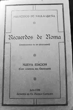 Across decades Ureña remained active animating various cultural events, organizations, and institutions in Jaén. The first such case was recorded in 1894, when he co-organized a workers' pilgrimage to Rome; he would later issue recollections from Italy in the last volume he published, Recuerdos de Roma (1925); it was printed by his daily El Pueblo Catolico.[89] Similar social flavor marked his activity in Sociedad católico-literaria de Amigos de los pobres in Torredonjimeno, operational in the mid-1890s.[90] At the turn of centuries he co-managed Ateneo Escolar Científico y Literario in Jaén;[91] unlike most Ateneos in Spain, which propagated the liberal blueprint,[92] this one remained zealously Catholic. In the 1910s and 1920s he took part in events organized by local Catholic organizations, like Juventud Católica.[93] Ureña was noted as "asiduo colaborador" of the Jaén cultural magazine, Don Lope de Sosa. Also, in the 1920s he co-launched two more periodicals, La Provincia in Úbeda[94] and El Eco Marteño in Martos,[95] though both proved short-lived.[96] Ureña's activities nationwide were usually related to so-called buena prensa, the association of Catholic newspapers and periodicals promoted by the hierarchy and aimed against the liberal press. In 1924 and as socio protector[97] he took part in Asamblea de Prensa Católica in Toledo.[98] He became a member-correspondent of the Real Academia Española de la Lengua,[99] yet neither the entry date nor the work which gained him entry are known; it might have been related to his loose translations of ancient authors (e.g. Horace) from Latin.[100]