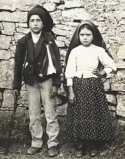 Francisco de Jesus Marto (11 June 1908 – 4 April 1919) and Jacinta de Jesus Marto (5 March 1910[1] – 20 February 1920)[2] were siblings from Aljustrel, a small hamlet near Fátima, Portugal, who, with their cousin Lúcia dos Santos (1907–2005), reportedly witnessed three apparitions of the Angel of Peace in 1916, and several apparitions of the Blessed Virgin Mary at Cova da Iria in 1917. The title Our Lady of Fátima was given to the Virgin Mary as a result, and the Sanctuary of Fátima became a major centre of global Catholic pilgrimage.
