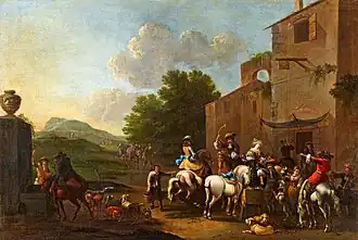 Hamers' artistic activity can best be characterised at that of a 'dozijnschilder' (literally 'dozen painter'), the name given to Antwerp painters in the 1670s who due to the economic downturn caused by the French invasions, created works for the market which imitated, borrowed from and copied other artists. In particular works of notably Dutch painters such as Philips Wouwerman, Pieter van Laer and Nicolaes Pietersz. Berchem were often the inspiration for these artists due to the market demand for battle and hunting scenes at the time. These works were produced in large quantities and distributed internationally to France, Austria, Spain and Portugal through art-dealers such as Guillam Forchondt and Bartholomeus Floquet.[3]