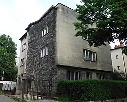 38 Francuska StreetHouse at 38 Francuska Street – the Darlewski tenement house from around 1938 designed by Jerzy Woyzbun. The building exhibits some similarities to Bohdan Pniewski's designs, with whom Woyzbun collaborated. Several elements are reminiscent of Pniewski's villa on Na Skarpie Alley – a small number of windows on the front and the massiveness of the walls above give the building the appearance of a defensive structure. Typical of the late 1930s fashion is the combination of wild materials (stone) with a smooth wall and soft lines (north elevation) with straight lines.[54] The building is listed in the register of monuments.[45]