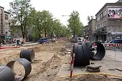Since 2006, Francuska Street has been the main venue for events during the Saska Kępa Festival.[18] In 2010, it underwent a major renovation. The surface, sidewalks, parking spaces, and bus stops were all replaced, and separate lanes for turning into subordinate streets were designated. On 22 December 2010, pre-Christmas illuminations were inaugurated.[19] In 2011, plaques commemorating the barricade from the September 1939 battles were unveiled.[20]