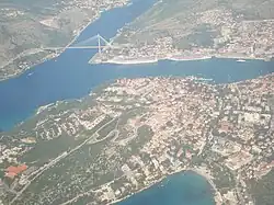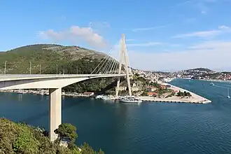 The Franjo Tuđman Bridge (Croatian: Most dr. Franja Tuđmana) is a cable-stayed bridge carrying the D8 state road at the western approach to Dubrovnik, Croatia across Rijeka Dubrovačka near Port of Gruž. The original bridge design was developed in 1989; however, construction was stopped at the onset of the Croatian War of Independence. Named after the 1st President of Croatia Franjo Tuđman, the bridge has been redesigned by the Structures Department of the University of Zagreb.[1][2]