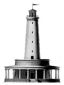 Funds for a light to mark the entrance to the Mississippi from the delta were appropriated in 1803 in the amount of $25,000, and plans were drawn up by Benjamin Latrobe; he designed an elaborate structure consisting of a tall central tower surrounded by a round house and colonnade, but the War of 1812 prevented work from going forward.[2] After the war, in June 1816, a lighthouse commission was formed, including Peter Le Barbier Duplessis,[3] Daniel Patterson, and architect Henry S. B. Latrobe, who revised his father's plans, but even at the then princely sum of $55,000 there was no taker for the work.[2] Finally Winslow Lewis was persuaded to take on the work, and besides demanding $79,000 for the work, he stipulated that an inspector supervise the work to verify that the design was being followed.