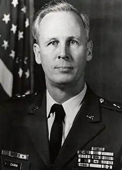 On returning to the United States, he served on the Army staff, where he was involved in tactical nuclear war planning. From 1970 to 1972, he was the chief engineer of the Corps of Engineers South Pacific Division. In this role he was involved with the Army's response to the environmental movement, and he was awarded a second oak leaf cluster to his Legion of Merit. He was then seconded to the United States Atomic Energy Commission as its Director of Military Applications from 1970 to 1972. As such, he oversaw the work of the nuclear weapons laboratories Los Alamos, Sandia, and Livermore, the Nevada Test Site, and nine nuclear weapon production plants. He was Assistant Deputy Chief of Staff for Operations from 1974 to 1975. His final assignment was as the deputy commander of Training and Doctrine Command from 1976 to 1977, supervising 26 Army schools and training centers and Army Reserve Officer Training Corps (ROTC), where he fostered the use of laser beams for simulating combat.[1][12] For his services he received the Army Distinguished Service Medal.[13] He retired from the Army in 1977 with the rank of lieutenant general.[12]