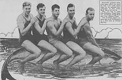 ![]() The 1932 Stanford Swimming Team, left to right, John McKelvey, Tuppy Gardner, Ted Wiget, Frank Booth and Osborne Clapp.[1] | |||||||||||||||