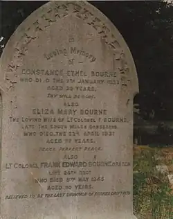 After Rorke's Drift, Frank Bourne served in British India and Burma, being promoted to Quartermaster-Sergeant in 1884.[2] He was commissioned in 1890. In 1893 he was appointed adjutant of the School of Musketry at Hythe, Kent, retiring from the army in 1907. During World War I, he rejoined and served as adjutant of the School of Musketry in Dublin.[3] At the end of the war, he was given the honorary rank of lieutenant colonel and appointed OBE. He retired for the 2nd time in 1919, at the age of 64.