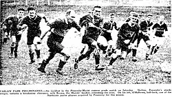 Halloran was then selected to make his Auckland debut against Wellington. It was not a full strength Auckland side as the match was a curtain raiser to the Auckland Pākehā match against Auckland Māori (Tāmaki) with both sides featuring a huge number of New Zealand and Auckland representatives. Halloran was chosen by selector Bert Avery at halfback to play alongside his Ponsonby teammate Walter Stockley who captained the side.[72] He played opposite Wellington halfback, J. Coman who was a former Wellington rugby union representative player.[73] Auckland won the early match 25–22 with the Herald publishing a photograph of Halloran shaping to kick after gaining possession from a scrum inside their own half.[74] With the scores tied 3-3 Halloran was involved in a passing movement after Ross Jones gathered the ball and gave it to J. Peterson who passed to Halloran, who gave it on to Stockley who scored.[75]