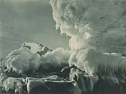 Hurley was also the official photographer on Sir Ernest Shackleton's Imperial Trans-Antarctic Expedition which set out in 1914 and was marooned until August 1916. Hurley's photographic kit for the expedition included the cinematograph machine, plate still camera and several smaller Kodak cameras, along with various lenses, tripods, and developing equipment, most of which had to be abandoned with the loss of their ship Endurance in 1915. He kept only a hand-held Vest Pocket Kodak camera and three rolls of film and for the rest of the expedition, he shot just 38 images. He also selected and saved 120 of his glass-plate negatives smashing about 400 remaining ones.[1] Some of the plates from the expedition are now part of the State Library of New South Wales collection.[3]