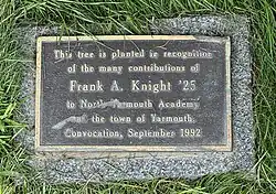 Knight cared for the tree for half of his life, having accepted the role in 1956. Knight's efforts were recognized by the Town of Yarmouth: the athletic fields at North Yarmouth Academy bear his name,[6] as does a forest behind the town's community garden;[12] a tree in front of NYA was planted in his honor; and, in 1983, he was the fourth recipient of the town's Latchstring Award.[13][14]