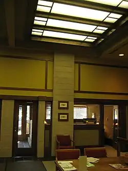 The building's most distinctive architectural feature is the fireplace, uncommon in office buildings, and the structure's only feature to incorporate Roman brick.[2][3] The present-day structure consists of one open, interior space, while Wright's original design divided the building into two sections. One section was used as Smith's real estate office, the other as the bank.[2] Wright also designed a full set of furniture for both offices, although much of it has been sold over the years.[2] One of the pieces of Wright-designed furniture in the building was a round-backed chair. The chair was at least the second attempt at a round-backed chair by Wright; an earlier, more successful attempt was completed in the Darwin D. Martin House. The chair has a bent-wood back, and rounded seat and stretchers. The total integration of the design is less successful than that used in the Martin House.[6] Other interior features include a now electrically lit skylight, oak trim, and exposed stonework.[3]