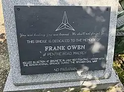 A memorial bridge was constructed near the Avon factory in Maerdy dedicated to Frank Owen's memory.[6] The memorial plaque contains the International Brigades emblem and commemorates Owen's sacrifice during the Spanish Civil War.[1]