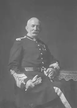 An official photograph of Richardson on a white horse in full dress uniform was taken outside the Hereford Police Station, Gaol Street, in 1919. This photograph was used in the local press and various publications which mentioned his career when he would retire at the end of the year.[51] He retired from his post on 30 December 1919.[52][53] His last official appearance in his position as Chief Constable of Hereford was appropriately enough in the court where he had presented many cases over the years on Friday 16 January 1920 when the mayor and city officials publicly thanked him for all his years of service. After a final bow to the court he, accompanied by his successor, Mr. Rawson, "addressed an unusually good muster of the city Police Force, who had formed up at the Parade Office at the Police Station."[54] A week earlier he had been presented with an illuminated address by the council and magistrates.[55] The city Fire Brigade held a separate presentation to their chief in the following week when he was reported to have made a long speech detailing the fires he had attended since 1883. He had also received a solid silver tea set from members of the Hereford City Police. During his time in office he had served three monarchs and over twenty mayors.