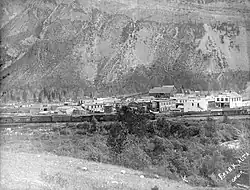 The town of Frank was founded in the southwestern corner of the District of Alberta, a subdivision of the North-West Territories, in 1901. A location was chosen near the base of Turtle Mountain in the Crowsnest Pass, where coal had been discovered one year earlier.[2] It was named after Henry Frank who, along with Samuel Gebo, owned the Canadian-American Coal and Coke Company, which operated the mine the town and its residents serviced.[3] Frank and Gebo celebrated the founding of the town on September 10, 1901, with a gala opening that featured speeches from NWT leaders, sporting events, a dinner and tours of the mine and planned layout for the community. The CPR ran special trains that brought more than 1,400 people from neighbouring communities to celebrate the event.[3] By April 1903, the permanent population had reached 600, and the town featured a two-storey school and four hotels.[4]