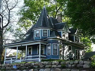 The Frank T. and Polly Lewis House is a historic house at 509 N. Main Street in Lodi, Wisconsin, United States.[2] The house was built in 1901-02 for house painter Frank T. Lewis and his wife, local milliner Polly Sparks Lewis. Prominent local architect Carl C. Menes designed the one-and-a-half story Queen Anne house. The house's design includes a polygonal tower with a steep pointed roof, a wraparound front porch supported by Tuscan columns, flared eaves with frieze boards, and a complex roof with several dormers. The Lewises lived in the house until Polly's death in 1907; Raymond J. Hillier lived in the house from 1918 until 1980.[3]