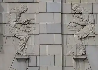 The Tory twins were well known for accepting a large range of commissions both big and small.[3] They are probably best known for the sculpture work on Sheffield City Hall which opened in 1932 and included an understated dentil corniche and narrow frieze on the central block as well as decorative carving to the tops of the Corinthian capitals. Their work on Sheffield Central Library (1934) includes medallions carved around the main entrance representing Literature, Music, Drama, Architecture, Sculpture, Painting, Mathematics, Chemistry and Astronomy. High up on the south-west corner of the library is an Egyptian type figure representing Knowledge and holding the ankh and asp to represent the choice between good and evil. The brothers contributed two friezes for the Mappin Art Gallery (1937), one above the main entrance depicts the Shrine of Knowledge with various creatures while the other on the east side portrays men working in the Sheffield metal trades.[1]