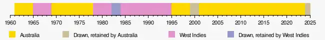 As of 2025, Australia hold the trophy following the 3–0 series victory in the 2025 series.[10] Australia also lead in overall wins, winning 16 of the 27 series, while the West Indies have won 8, the remaining 3 ending in draws (with the trophy being retained by the incumbents).[1][11] Brian Lara is the most successful batsman in the history of the trophy, scoring 2,815 runs for the West Indies in 56 innings at an average of 52.12.[3] He also holds the record for the highest score (277) which he made in the third Test at the Sydney Cricket Ground during the 1992–93 series.[12][13] West Indian fast bowler Courtney Walsh has taken the most wickets in the trophy, with 135 over 38 matches, at an average of 28.68,[4] while Australia's Graham McKenzie has the best bowling figures of 8 wickets for 71 runs, achieved in the second Test of the 1968–69 series.[12][14] Australian Mark Waugh has taken the most catches, with 45 in 28 matches,[15] while West Indian Jeff Dujon is the most successful wicketkeeper, making 84 dismissals in 23 matches.[16]