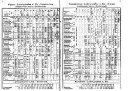 After the opening of the Kaiserslautern–Frankenstein section in December 1848, a total of three train pairs originally ran to Homburg. In 1865, there were three train pairs on the Worms–Neunkirchen route.[34] In 1871, the travelling time for passenger trains took between 27 and 31 minutes from Frankenstein to Kaiserslautern and up to 40 minutes to Neustadt.[35] In 1884, local trains ran primarily on the NeunkirchenWorms route. In addition there were trains, which ran only on part of the line such as Neustadt–Kaiserslautern and Kaiserslautern–Worms. Some did not stop at all stations, and Frankenstein was not served by all local trains.[36]