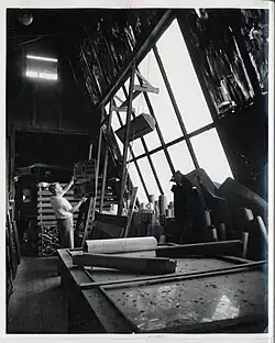 Franklin Art Glass Studios, Inc. was founded in 1924 with three principals, Wilhelm Kielblock, Wilhelm Kielmeier, and Henry ‘Elmore’ Helf. Originally located at 135 East Spring St. company’s creation was during the depression and as the depression deepened and commissions for stained glass continued to decline, Wilhelm Kielmeier pulled out of the company. This left Wilhelm Kielblock, a noted German stained glass designer and painter,[2] and Elmore Helf, a business man, to reorganize the company. Elmore Helf was not the first member of the Helf family to run a stained glass studio, his father, Henry Helf, was shop foreman for Von Gerichten Art Glass Company in Columbus, Ohio.[3] Henry worked there until the company’s closing in 1931 and passed his love and the trade of stained glass onto Elmore. To keep Franklin Art Glass alive during those difficult times the decision was made that Kielblock would relinquish his ownership of Franklin Art Glass, which was actually his portion of the debt, to Helf. Kielblock would then operate as an independent contractor under the name, Ohio Trade Studios, all the while operating in the same building as Franklin Art Glass. Through this arrangement Helf would sell the Munich – style commissions designed and painted by Kielblock’s Ohio Trade Studio. This arrangement continued until Wilhelm Kielblock’s death in 1987. After successfully riding out the depression Franklin Art Glass became a financially stable stained glass studio working on residential and liturgical commissions. In 1945 Elmore’s son, James Helf assumed control of the company after returning home from serving in WWII.[4] Business was as usual until Franklin Art Glass was approached by Wendy's Old Fashioned Hamburgers, who were building their first hamburger stand just a few blocks from Franklin’s then Oak Street location. Wendy’s interior decorator wanted to use stained glass lamps in the restaurants, and with the help of Franklin Art Glass, they designed a series of hanging lamps which would eventually become synonymous with Wendy’s restaurants. Throughout the 1960s and 1970s Franklin produced over 45,000 lampshades for Wendy’s and even expanded its employees to 40 to keep up with the demand.[5][6]