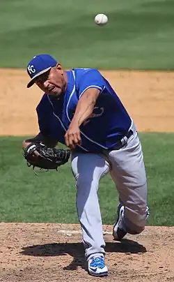 Morales signed a minor league contract with the Kansas City Royals on February 19, 2015 and made the team out of spring training.[12] He got his first win with the team on April 19, throwing the final two pitches of an at bat to Brett Lawrie after Kelvin Herrera was ejected for throwing at Lawrie.[13] Morales finished the 2015 season with a 3.18 ERA, 41 strikeouts, and a 4-2 record in 67 relief appearances. With the Royals finishing the season 95-67, the team clinched the AL Central and eventually won the 2015 World Series against the New York Mets, their first championship in 30 years. It was the second championship Morales won in his career.