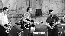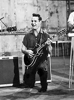 With the Comets, Franny Beecher played a black 1956 Gibson Les Paul Custom which was given to him by the Gibson Guitar Company, then based in Kalamazoo, Michigan. Gibson also gave Bill Haley a blonde 1956 Super 400 and a black 1956 Gibson L-7. The Les Paul Custom featured a pair of black single coil P-90 pickups, one of which was a bar magnet P-90. Earlier, he had played a Gibson L-5 acoustic with a cutaway body and a DeArmond pickup, as noted in Sound and Glory, page 100. He played an Epiphone Emperor when he was a member of the Benny Goodman band in 1948 and 1949, which he also played on the Ed Sullivan Show during a performance of "Rock Around the Clock". In the Mexican film Juventide y rebeldes (1961), he is playing either a Gibson ES-345 or ES-355 Stereo. His other guitars included a blonde 1959 ES-350T, which in his later years he no longer owned. He played a cherry sunburst Gibson ES-137 Classic in concerts and while touring. In October 2007, Beecher performed as a special guest of the Rib House Band at the Bridgeport Rib House in Bridgeport, Pennsylvania.