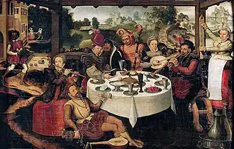 A few genre paintings have been attributed to Frans Pourbus. These paintings fall mainly in the genre of the so-called merry companies. The key work is the Prodigal son among courtesans (Museum Mayer van den Bergh). It depicts a merry company known as a buitenpartij, i.e. a scene of people from the middle class enjoying an outdoor party rather than the lowly peasant scenes that were often the subject of genre paintings. Another example is the Merry company (At Lempertz auction of 21 November 2009, lot 1018B). The male and female participants in this composition are wearing clothes in the latest fashion such as high hats, puffed pants and ruff collars. They are enjoying themselves in the outdoors in a garden with plenty of food, drink, music and dance. The scene also includes a black page and a jester. The composition includes allusions to the aristocratic pursuit of hunting such as the dog in the foreground and the falcon on the right. Some couples on the right have separated themselves from the revelers at the table and their amorous intentions are all too clear.[3]