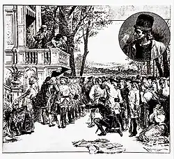The exhibition had a strong national-political undertone. One of the main works of art newly created for the exhibition was a large painting by Mikoláš Aleš with a historic theme of “The Slaughter of the Saxons at Hrubá Skála”. The canvas was exceptional due to its acute political context and its size of 10 × 8.5 m. The image of the painting is based on the Manuscript of Dvůr Králové, the authenticity of which was strongly disputed at the time of its creation.