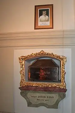 Franz Alexander Kern (11 April 1897 - 20 October 1924), also known by his religious name Jakob, was an Austrian Roman Catholic priest and a professed member from the Premonstratensians.[1] Kern served as a soldier in the Austro-Hungarian armed forces during World War I and suffered threatening injuries that impeded his health for the remainder of his life and which often hampered his studies. He fostered an intense devotion for the Eucharist - for which he was known - and was often found in constant Eucharistic Adoration.[2][3]