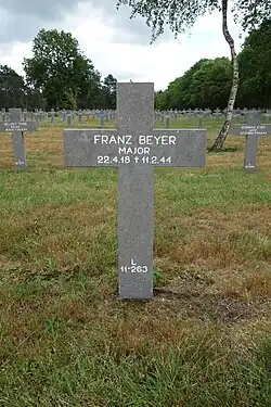 Franz Beyer (22 April 1918 – 11 February 1944) was a German Luftwaffe fighter pilot during World War II and a recipient of the Knight's Cross of the Iron Cross of Nazi Germany. Beyer was killed on 11 February near Venlo, the Netherlands after dog-fighting with British Spitfires. During his career he was credited with 83 aerial victories, 6 on the Western Front and 77 on the Eastern Front. On 1 June 1943, Beyer was appointed Gruppenkommandeur of IV. Gruppe of Jagdgeschwader 3.[1]