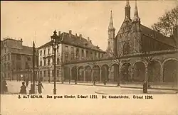 It was founded in 1250 in the early Gothic style as a monastery church for a Franciscan house. It was a fieldstone church, 52 metres long and 16 metres wide. Its remains can be found in the north wall of the present ruins. This was replaced with a three-aisled brick basilica church, begun at the end of the 13th century and completed in the first half of the 14th century, whose ruins still survive. In 1365 Louis II, Elector of Brandenburg was buried there. Around 1500 it was renovated.