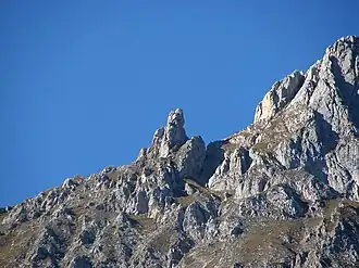 The Frau Hitt (2,270 m (AA)) is a peak in the Nordkette, the southernmost mountain chain of the Karwendel in Austria. In appearance it resembles a woman (German: Frau) on a horse, hence the name.